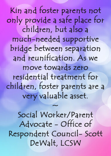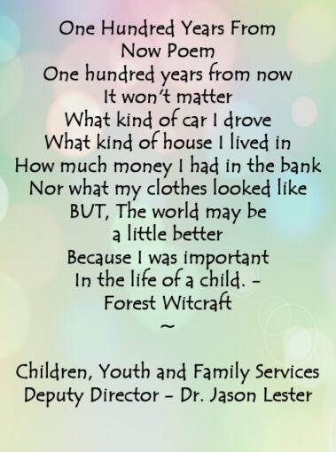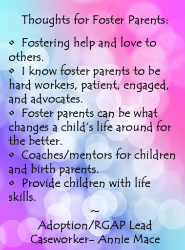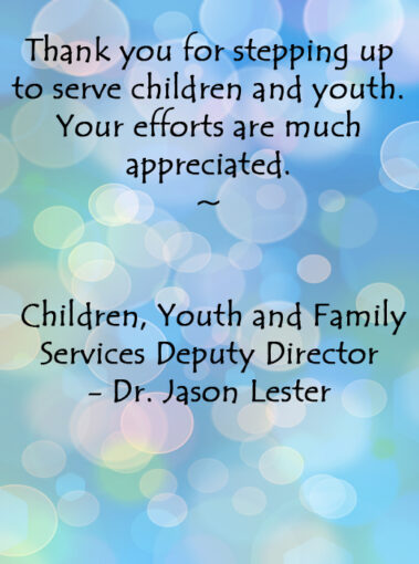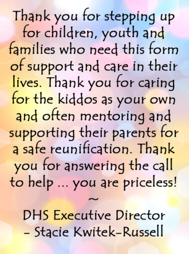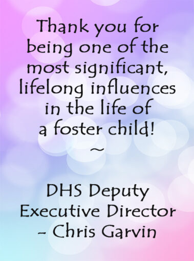 Many different entities are part of foster care. This month is an opportunity to acknowledge foster parents, family members, volunteers, mentors, policymakers, child welfare professionals, and other members of the community who help children and youth in foster care find permanent homes and connections. The Department of Human Services is one agency of many dedicated entities, non-profits and individuals working together to protect children and strengthen families.